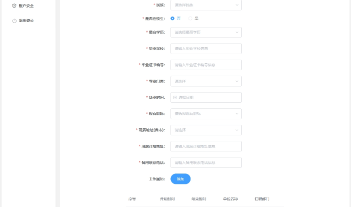 如不是在校应届生须在“是否是在校生”处选择“否”,然后根据下方提示填写个人信息并上传工作履历;