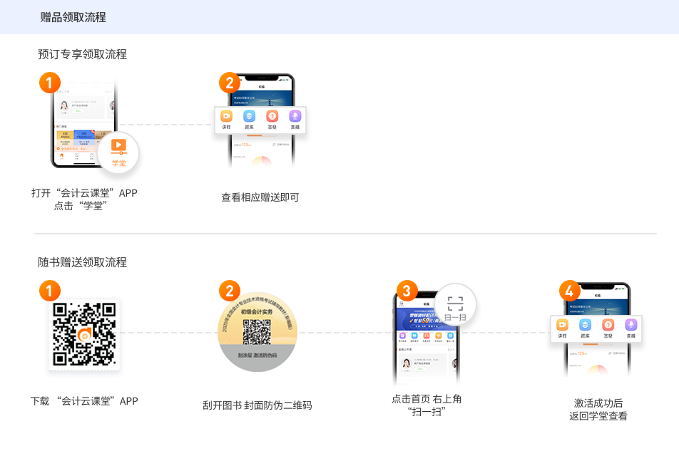 | 同步练习题库 | 【随书赠送】本书试题支持APP在线同步做题,您可以在APP“题库”专区相应模块做题。 | 登录”会计云课堂app“,点击“我的”—“图书激活”,扫描防伪标签码激活后,返回学堂查看即可。 | |