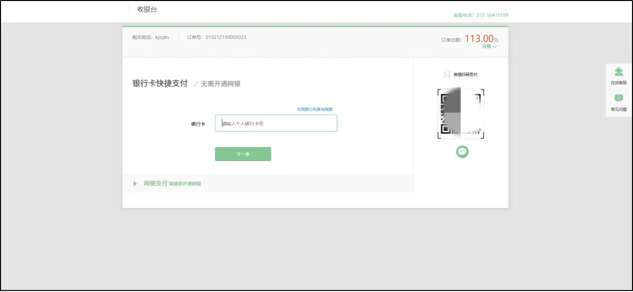 等待审核通过后,重新选择考试会直接进入到网上缴费的页面。页面展示考生报名基本信息、订单基本信息、支付平台以及缴费状态信息。如下图所示: