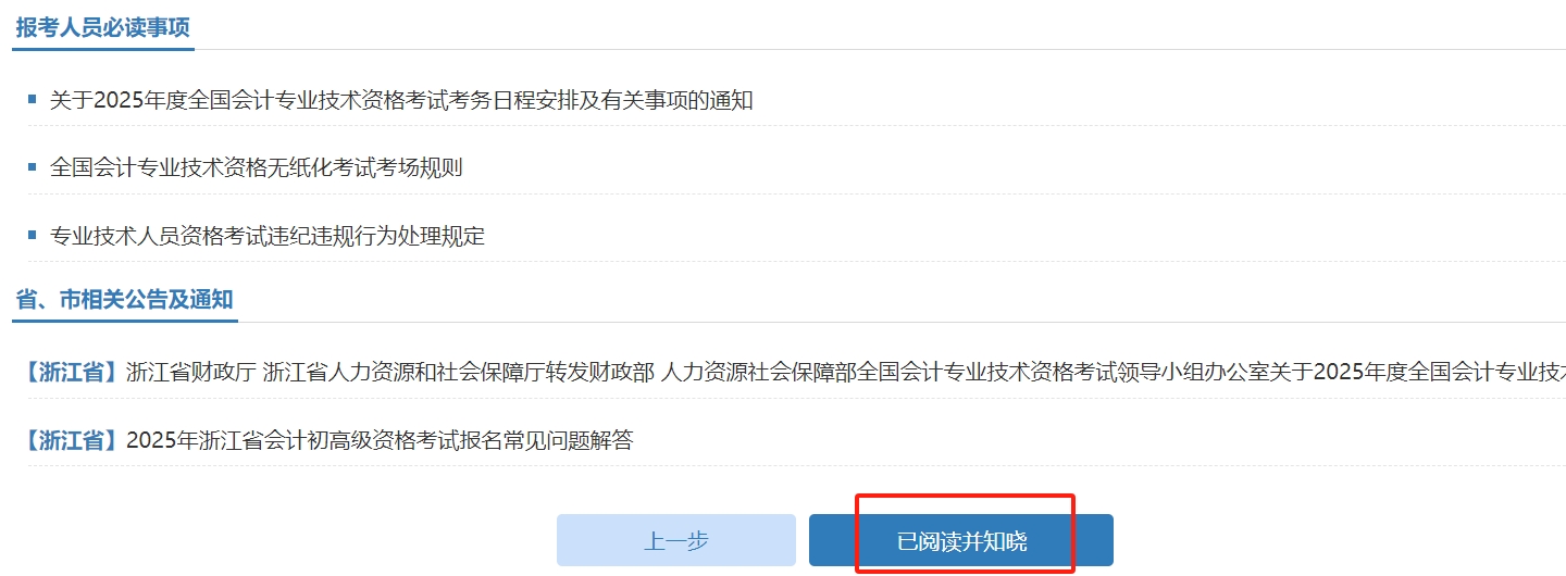 完成阅读须知后,进入到所选择省份设置的通知公告页面,包括报考人员必读事项以及省、市相关公告及通知。点击“已阅读并知晓”,如下图所示: