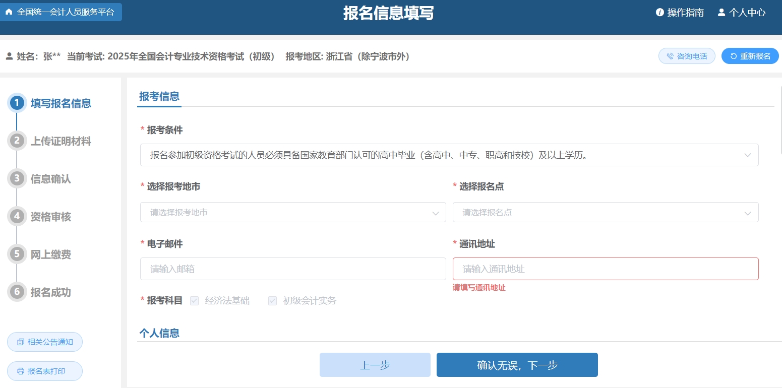 报考信息填写完毕后点击“确认无误,下一步”,进入到证明材料上传页面(注:各省报名流程及证明材料略有差异)。