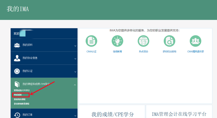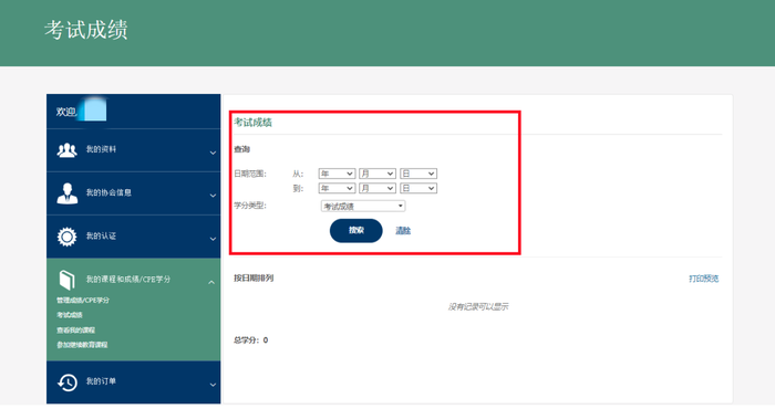 点击左侧菜单栏中“我的课程和成绩/CPE学分”,点击“考试成绩”进行查询