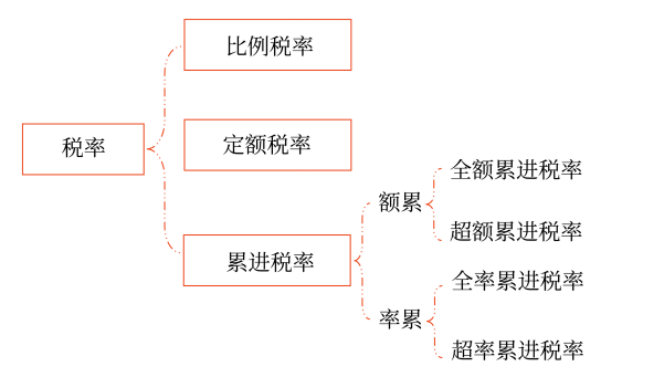 比例税率 | 单一比例税率 差别比例税率 幅度比例税率 | 烟叶税、车辆购置税、增值税、城市维护建设税、契税、企业所得税等 |