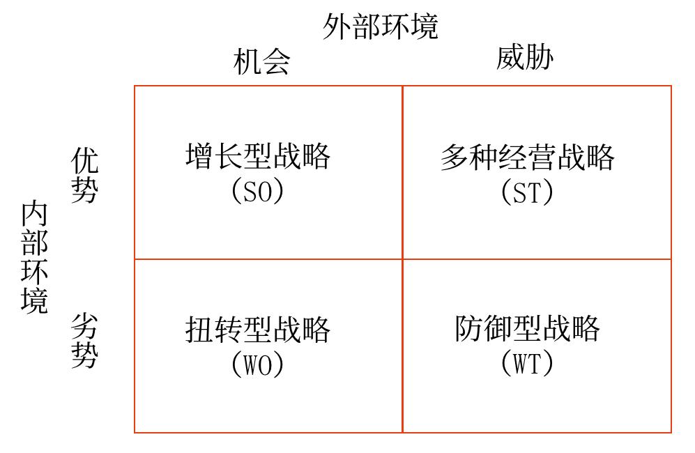 在对企业的内外部环境分析之后,需要一个分析工具对上述分析内容进行综合,这就是SWOT分析。SWOT分析是对企业的内部条件和外部环境的各方面内容进行综合概括,通过分析企业内部的优势和劣势及外部面临的机会和威胁,进而帮助企业进行战略选择的一种方法。
