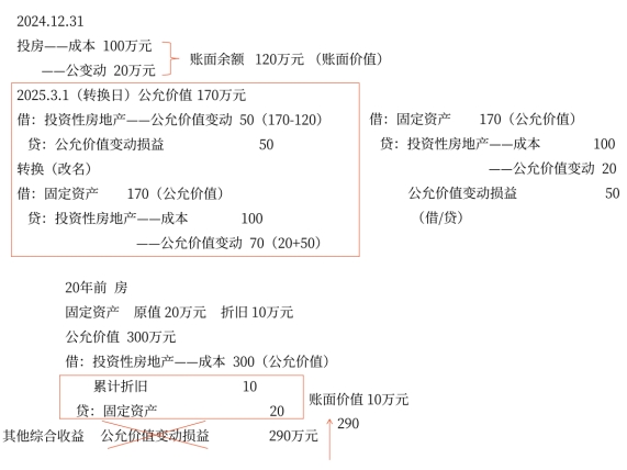 (1)投资性房地产转为自用房地产 | 借:固定资产/无形资产(公允价值) 贷:投资性房地产—成本 —公允价值变动(可借可贷) 公允价值变动损益(可借可贷) | |