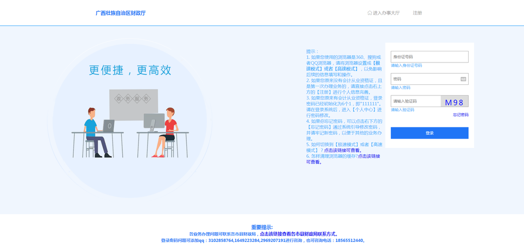 学员原来有会计证的,输入身份证、密码、验证码,点击登录即可。如果原来没有会计证,且是第一次办理业务的,请直接点击右上方的“注册”进行个人信息完善。