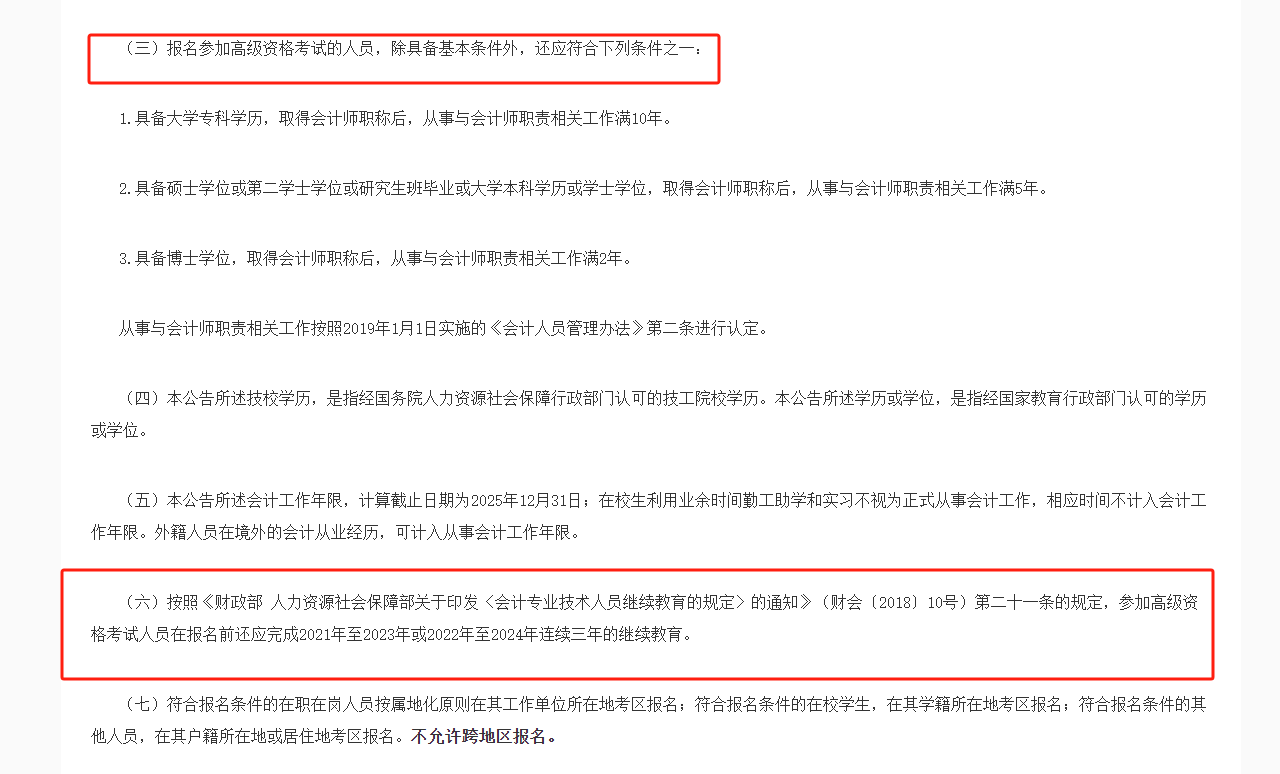 【江西】:“按照《财政部 人力资源社会保障部关于印发〈会计专业技术人员继续教育的规定〉的通知》(财会〔2018〕10号)第二十一条的规定,参加高级资格考试人员在报名前还应完成2021年至2023年或2022年至2024年连续三年的继续教育。”