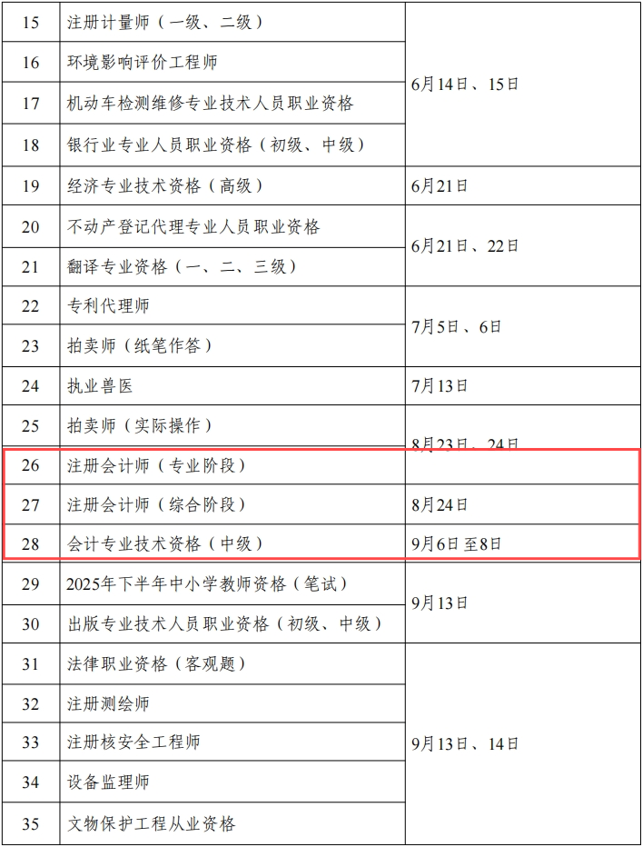 各类行业竞争越来越卷,压力越来越大,大家把目光纷纷投入到职称考试上,力求在翻卷海浪中能顺利上岸,有所收获。有行业认可的证书加持在身,就能比别人更具有优势和不可替代性,会计行业亦是如此。人力资源社会保障部办公厅近日发布《关于2025年度专业技术人员职业资格考试工作计划及有关事项的通知》,身为会计从业人员,除了需要完成会计继续教育,也可以依照此表制定新一年的考试计划了!