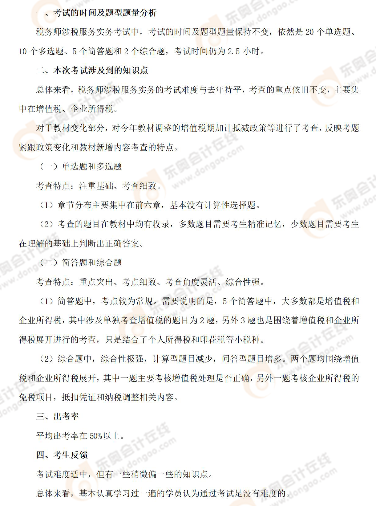 税务师考试《涉税服务实务》科目考试已经结束,涉税服务实务科目一直有着强综合性的特点,今年的考试内容难度如何呢?下面是东奥会计在线根据考生反馈整理的《涉税服务实务》科目考情分析及考点总结,快来看看吧!