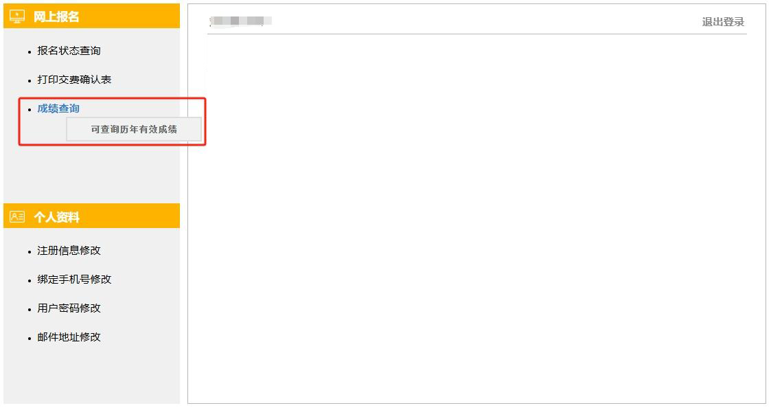 第2步:登录成功后,点击左侧“成绩查询”按钮,网报系统提示,考生也可在此查询历年有效成绩。