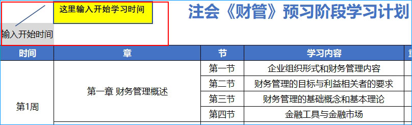 选中学习计划表后,回到表格最上方,在灰框位置输入起始学习时间,生成学习计划。