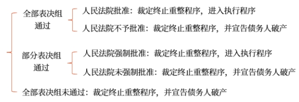 各表决组均通过重整计划草案时,重整计划即为通过,自重整计划通过之日起10日内,债务人或者管理人应当向人民法院提出批准重整计划的申请。重整计划中关于企业重新获得盈利能力的经营方案具有可行性、表决程序合法、内容不损害各表决组中反对者的清偿利益的,人民法院应当自收到申请之日起30日内裁定批准重整计划,终止重整程序,并予以公告。
