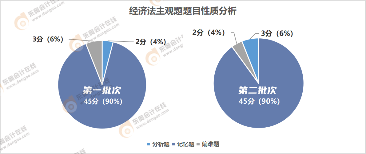 注会经济法主观题考查类型包括分析题、记忆题、陷阱题和偏难题。第一批次考试中,未出现陷阱题,记忆题分值最高,为45分;第二批次考试中,未出现分析题,其中记忆题占比90%,分值为45分。