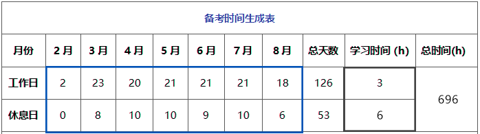 例如:从2月27日开始,接下来的每一天都学习,工作日学习3小时,休息日学习6小时,那么在8月25日考试之前,共能学习696小时。