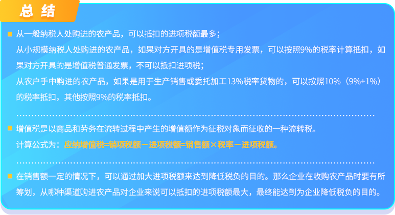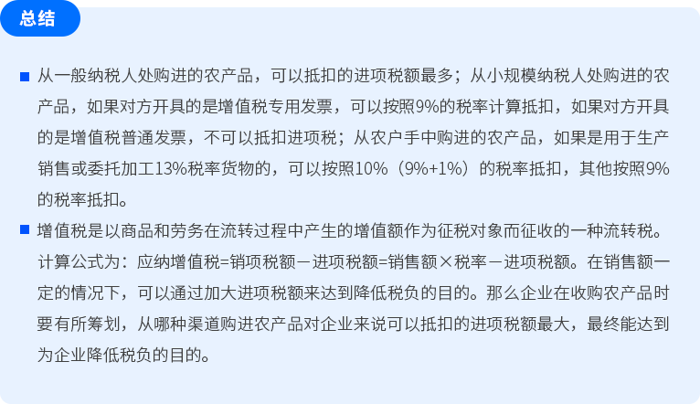 从一般纳税人处购进的农产品,可以抵扣的进项税额最多;从小规模纳税人处购进的农产品,如果对方开具的是增值税专用发票,可以按照9%的税率计算抵扣,如果对方开具的是增值税普通发票,不可以抵扣进项税;从农户手中购进的农产品,如果是用于生产销售或委托加工13%税率货物的,可以按照10%(9%+1%)的税率抵扣,其他按照9%的税率抵扣。