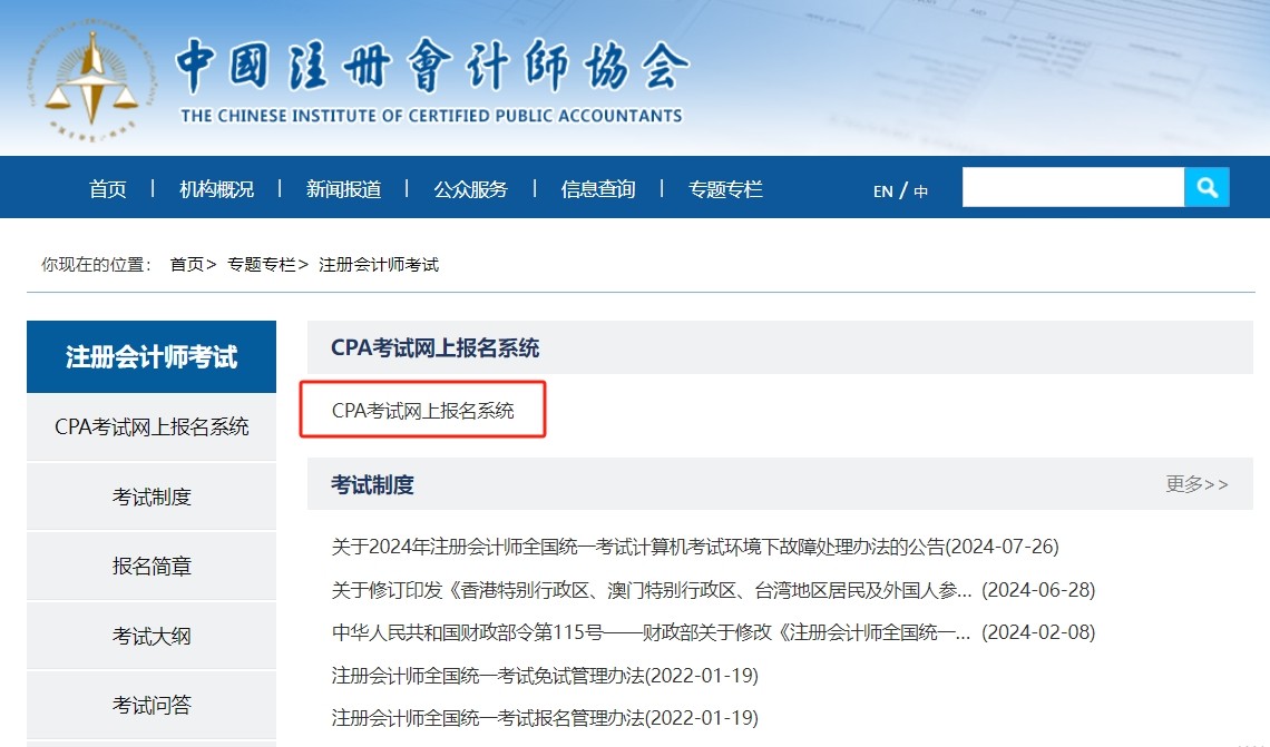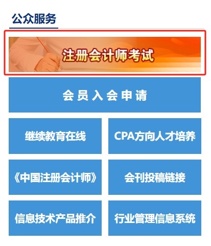 第1步:访问中国注册会计师协会官方网站(//www.cicpa.org.cn/),找到“公共服务”板块,点击“注册会计师考试”。
