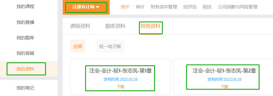■ 步骤二:选择“注册会计师”考种,点击侧边栏“我的资料”栏目,选择“其他资料”选项,即可下载《轻一》电子版内容!