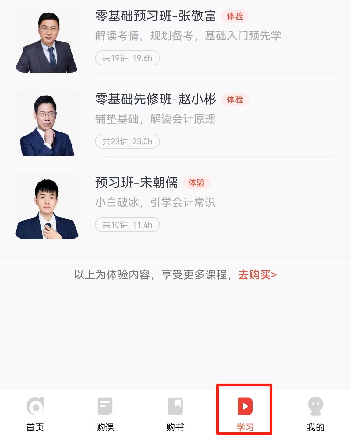 | ■ 步骤三:点击屏幕最下方“学习”选项 | ■ 步骤四:进入学习栏目后,点击上方“更多”,展开全部学习工具 |