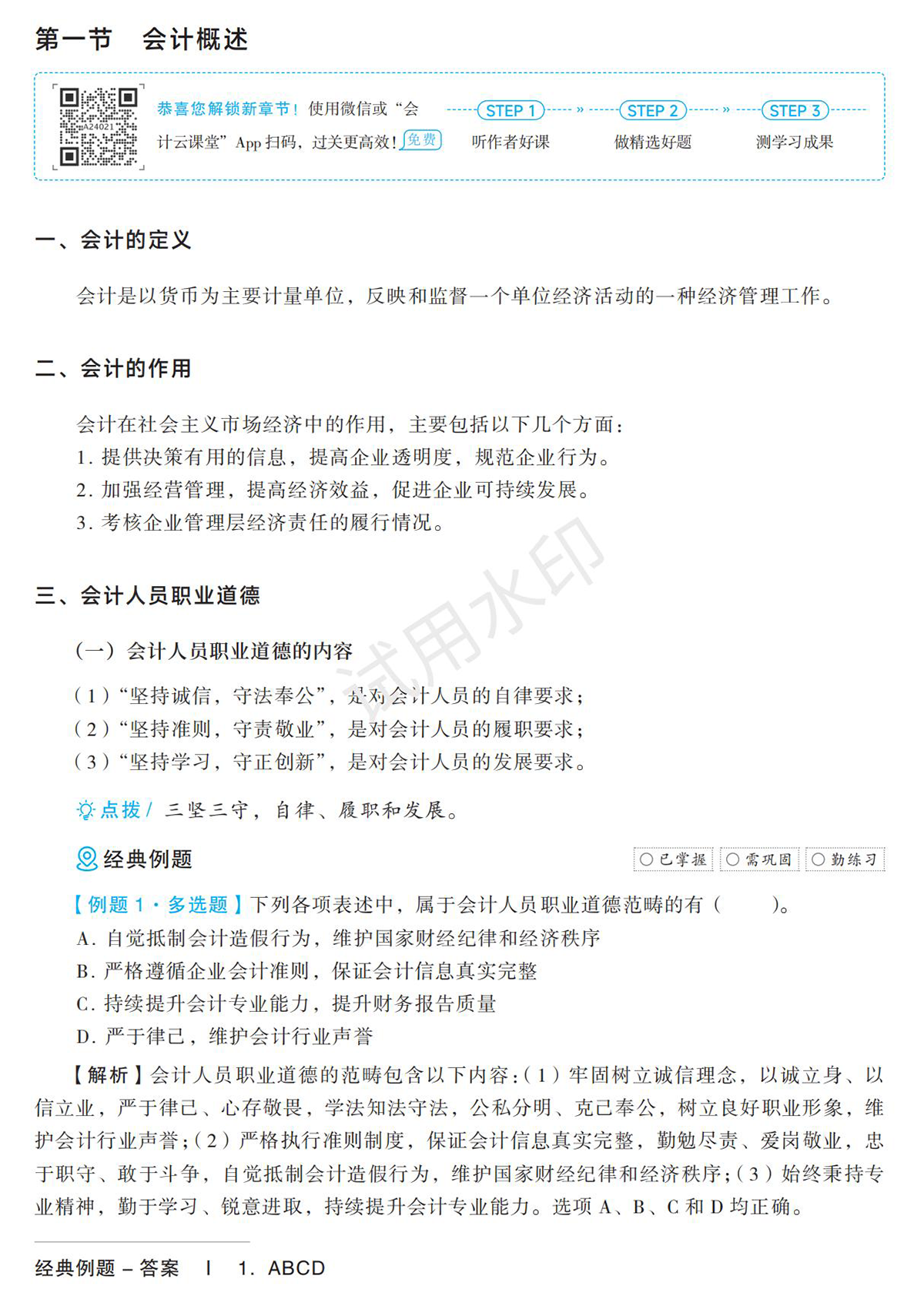 最后是经典真题及新编好题部分,《轻一》将历年考试中涉及该章节考点的习题也编入书中,全章知识学完后,可搭配扫码视频讲解,了解往年的真题是如何考查的,掌握出题思路和方向。同时还配有精编好题,顺应未来考试趋势新编习题,帮助考生检测知识掌握情况。习题、答案解析分开的模式,可最大程度测出你真实的水平。