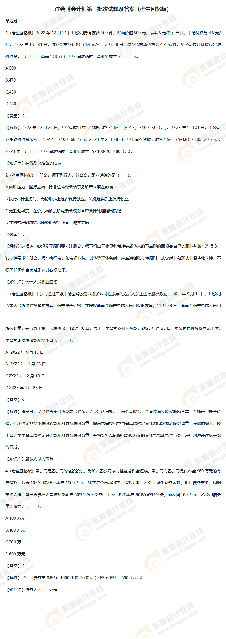 2023年注会会计考题及参考答案第一批次(考生回忆版)