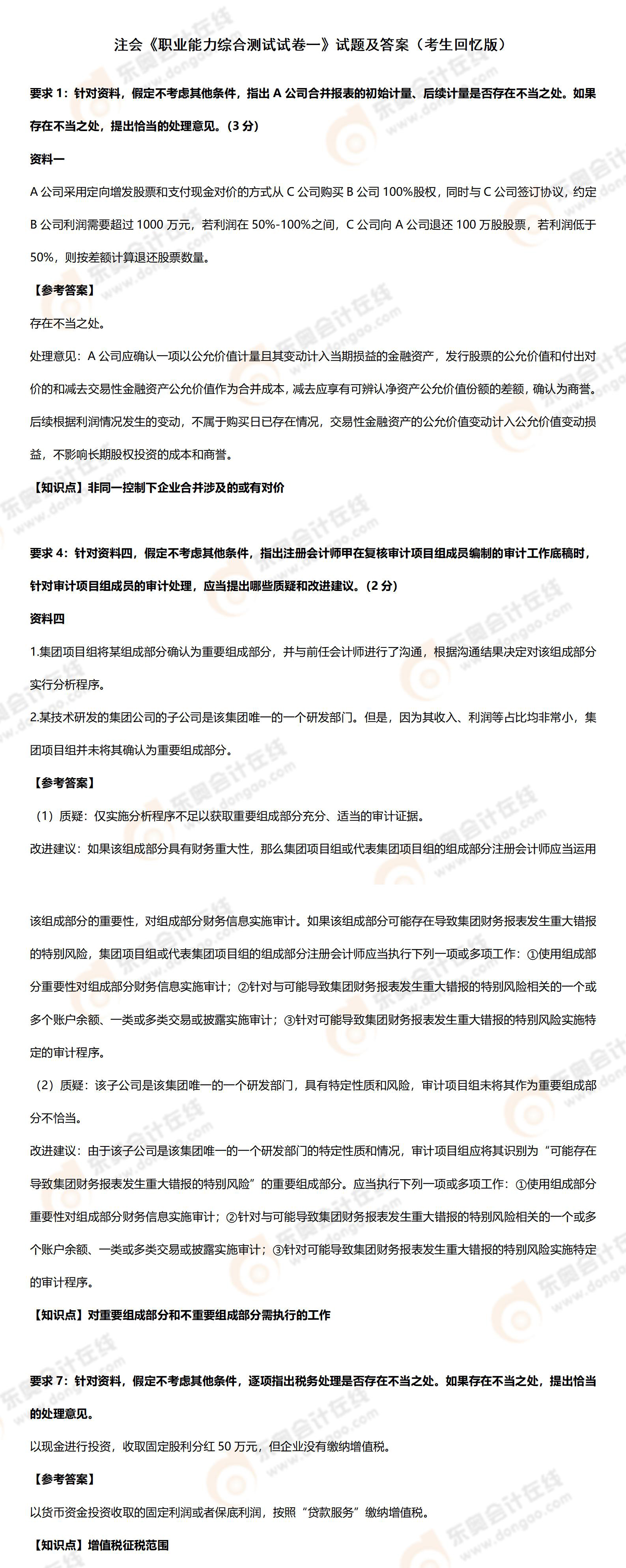 2025年注会综合阶段试卷一考题及答案解析(考生回忆版)