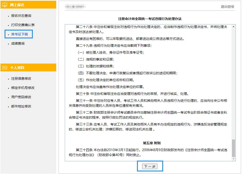 第三步:阅读《注册会计师全国统一考试违规行为处理办法》后点击“下一步”;