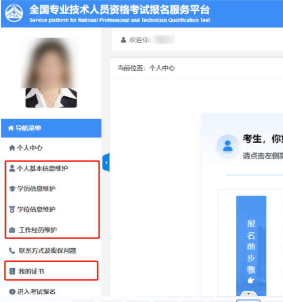 变化三:报名界面左侧导航菜单栏,新增“个人基本信息维护、学历信息维护、学位信息维护、工作经历维护、我的证书”选项。