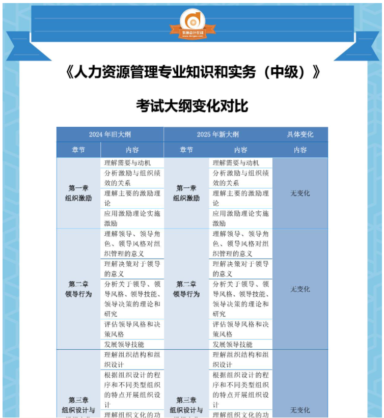 2025年中级经济师《人力资源》考纲已新鲜出炉。与2024年相比,整体变化约5%,第6、19章修改了章名,第4、6、12章新增部分知识点,其余章节无实质性变化。具体的变化对比文字版请在下文下载。