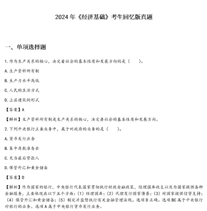 2024年中级经济师《经济基础》考试部分已经结束了,为了快速帮助各位考生了解考试内容,东奥教研团队根据考生回忆将考试真题及答案解析总结如下,真题为考生回忆版(随着考试的进行不断更新内容),考生可持续关注下载页面,并先参考第一版!