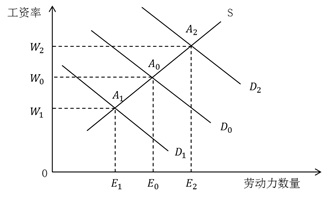需求曲线移动对均衡位置的影响 (共4条) | (1)劳动力需求曲线的移动方式有两种,一是向左移动,二是向右移动 (2)向左移动意味着在工资率不变的情况下,劳动力需求整体上缩小了;向右移动意味着在工资率不变的情况下,劳动力需求整体扩大了 (3)当劳动力供给曲线不变,而劳动力需求曲线右移时,新的均衡点A2对应的均衡工资率W2和均衡就业量E2,都比初始均衡点A0所对应的均衡工资率W0和均衡就业量E0数值更大,这说明均衡工资率和就业量均随需求曲线右移而上升 (4)反之,当劳动力供给曲线不变而劳动力需求曲线左移时,均衡工资率和均衡就业量同时下降