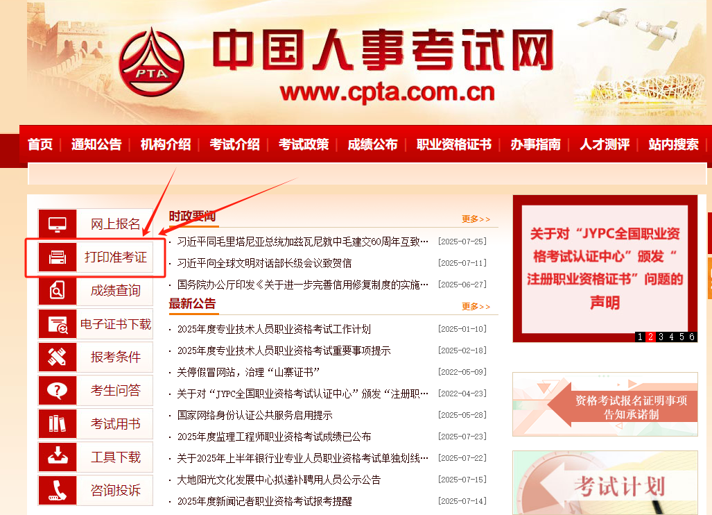 访问中国人事考试网(//www.cpta.com.cn),点击首页左侧导航栏的“打印准考证”按钮。