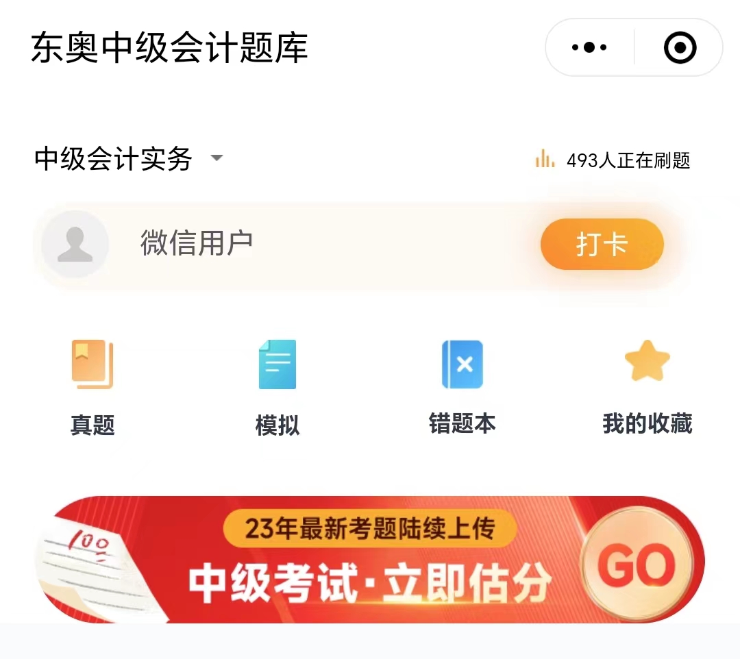 步骤1:进入小程后,登录东奥中级会计题库小程序,并点击下方“中级考试·立即估分”按钮。
