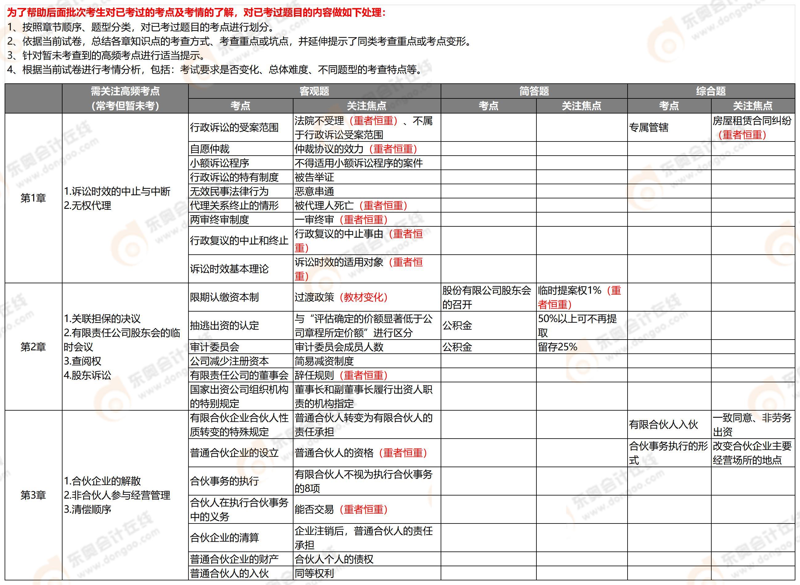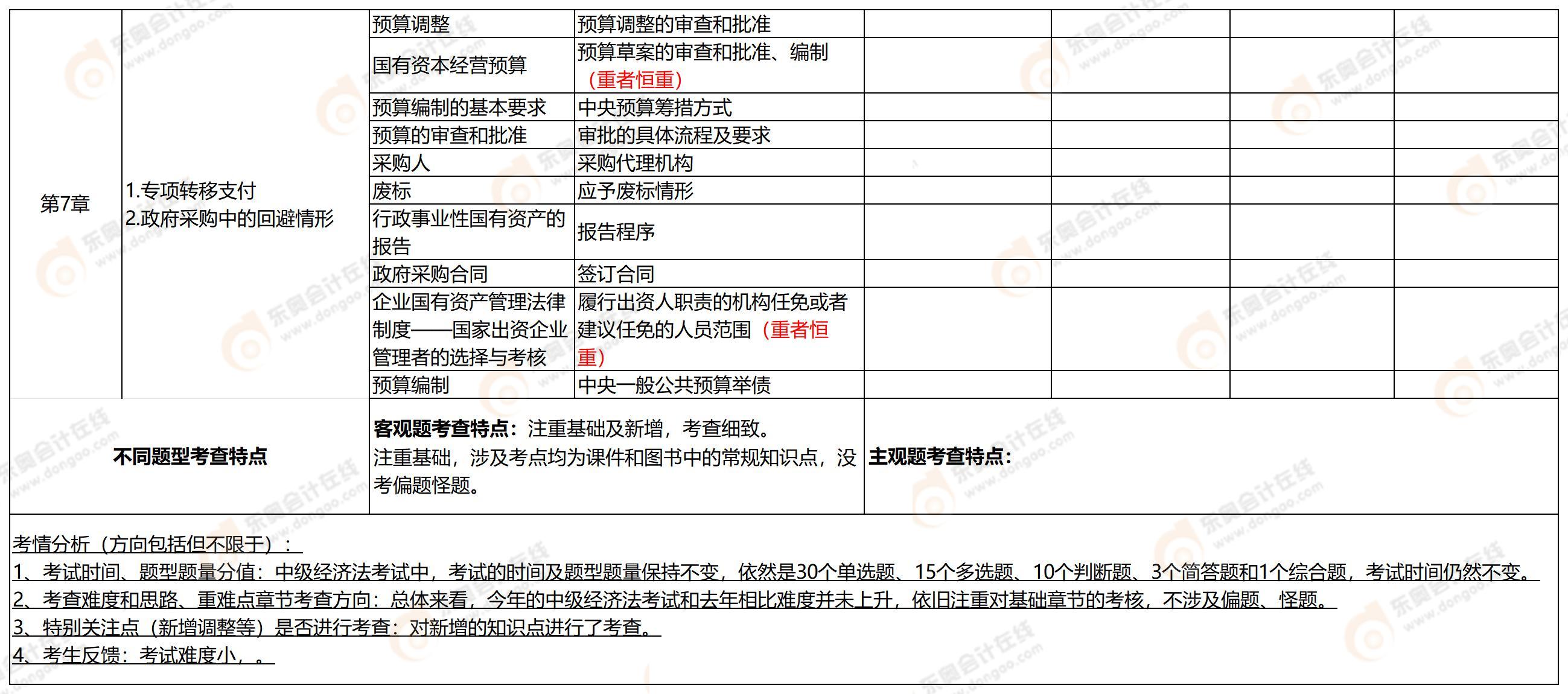 总体来看,中级经济法的考试难度与去年相比基本持平,主要考查基础、常规的知识点。考查的重点依旧不变,主要集中在第一章、第二章、第四章、第五章、第六章、第七章。相较于往年,客观题中,第一章、第七章的考查分值有所上升;主观题中,第六章金融法律制度的考查分值有所上升。综合题结合了第一章、第三章、第四章、第五章、第六章,综合题体现出来的各章节融合度很高。考点相对常规,专属管辖、有限合伙人入伙、合伙事务执行的形式、按份共有、租赁合同、民间借贷的计息规则等都是比较重要的知识点。