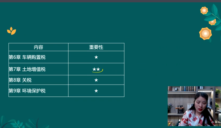 共九章。其中重点为第二章章节增值税、第三章消费税;其次是第五章资源税、第七章土地增值税,在小税种中算是比较重要的知识点,可以以主观题的方式进行考查;其他章节均为小税种,多以客观题的方式进行考查。
